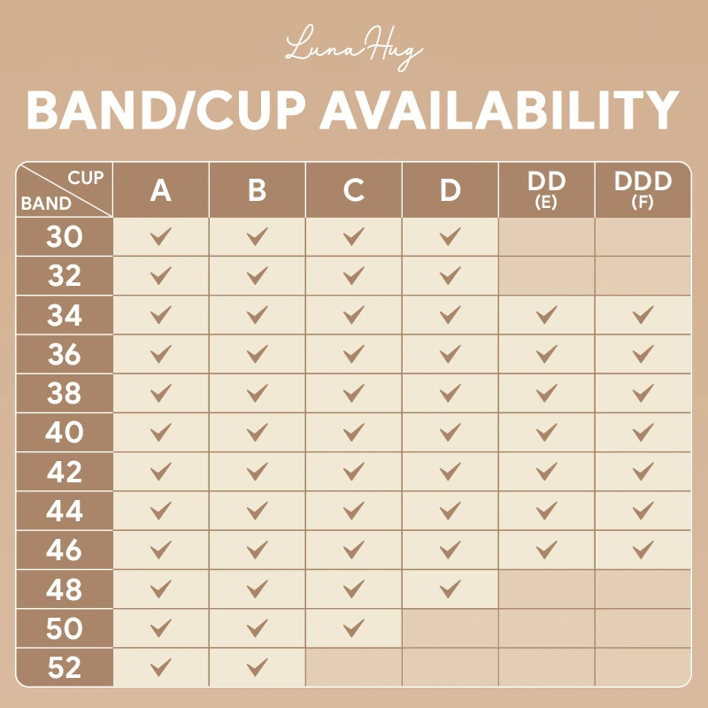 LunaHug bra fits true to size, offering a comfortable and supportive fit. We recommend you select your regular size.
